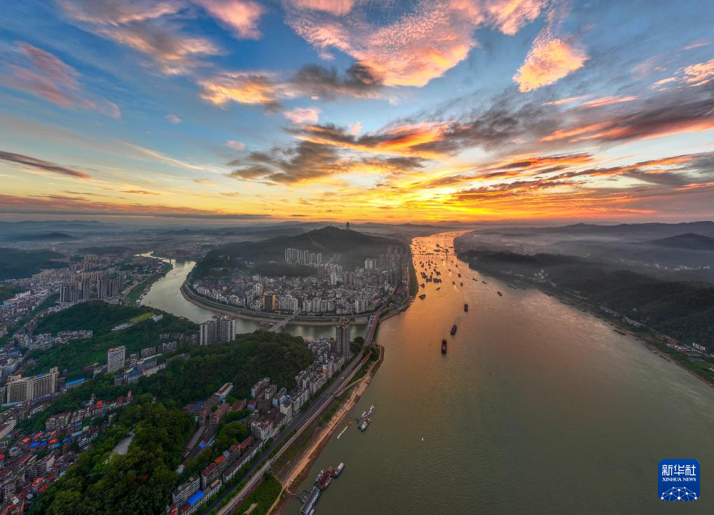 Lever de soleil près du fleuve Xijiang, à Wuzhou, dans la province du Guangxi (sud). (Photo prise par drone le 16 septembre)