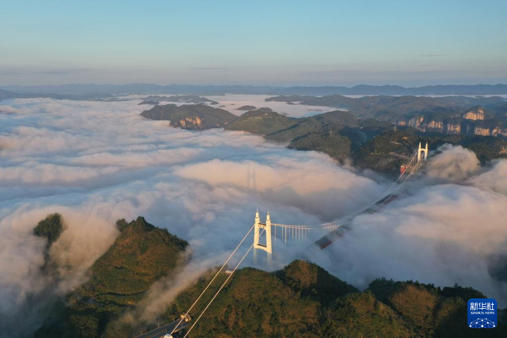 Le pont suspendu d'Aizhai, situé à Jishou, dans la préfecture autonome Miao et Tujia de Xiangxi, dans la province du Hunan (centre). Photo prise par drone le 16 septembre.