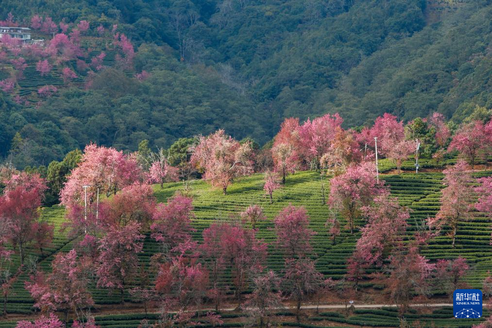 Photo aérienne prise le 24 décembre 2025, montrant des cerisiers en fleurs sur le mont Wuliang, situé au xian de Nanjian, dans la province chinoise du Yunnan (sud-ouest). Sous un ciel bleu, de nombreux cerisiers aux teintes rosées se dressent au milieu des champs de thé verdoyants, offrant à la vue un paysage féerique. (Chen Shuo /Xinhua)