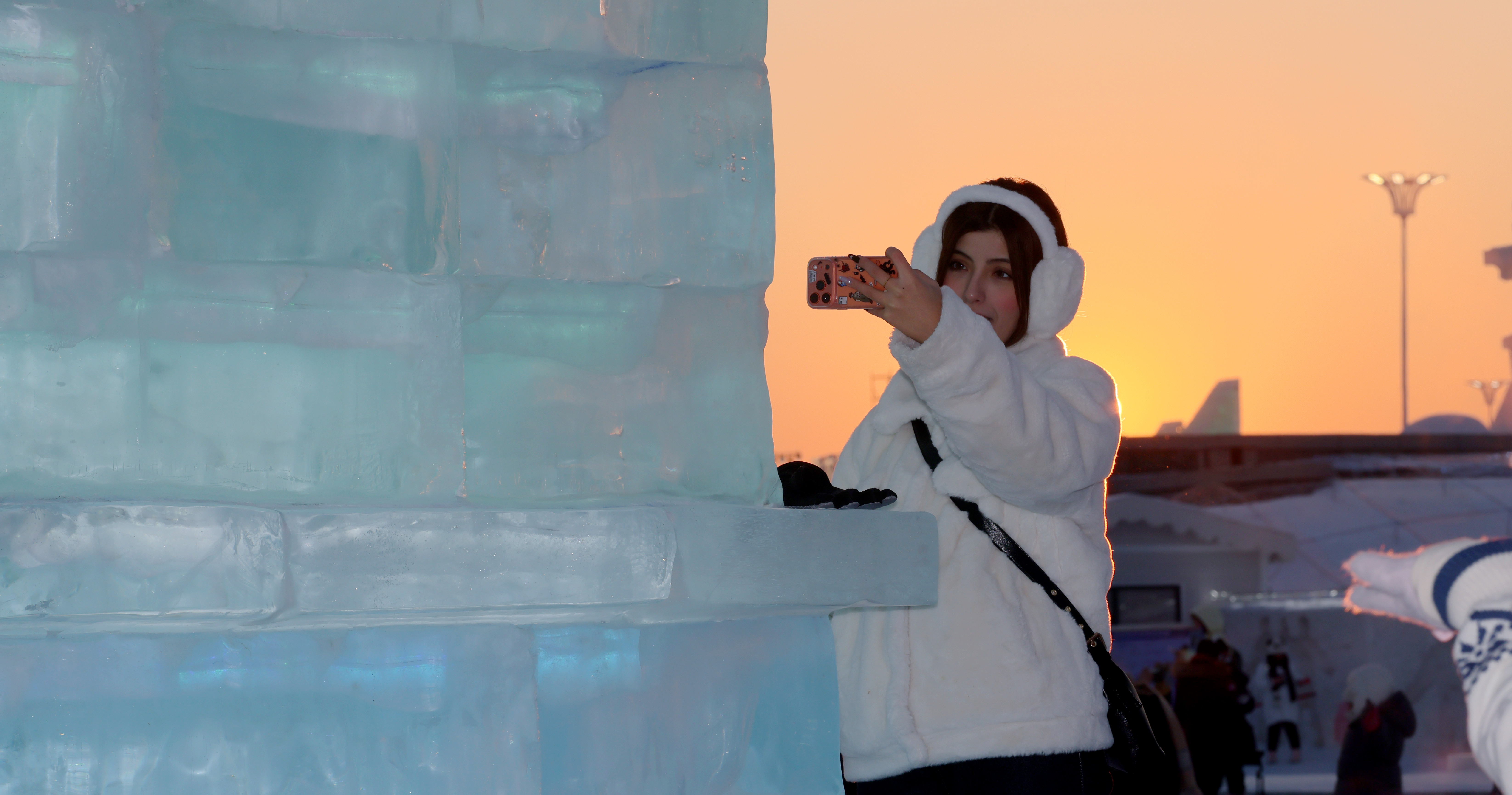 À l’heure où le soleil décline à l’horizon, les derniers rayons du jour illuminent le Monde de glace et de neige de Harbin d’un éclat doré et chaleureux, enveloppant le site dans une atmosphère romantique dont les visiteurs profitent pleinement.