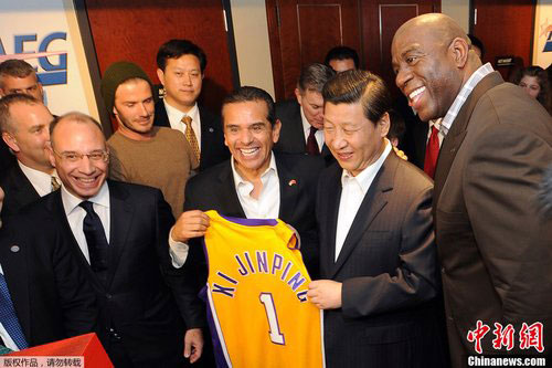 Le 18 février, avant de rentrer d'une visite aux États-Unis, Xi Jinping a assisté à un match NBA des Lakers au Staples Centre, à Los Angeles. Après le match, David Beckham et Magic Johnson lui ont offert des maillots et des chaussures de sport.